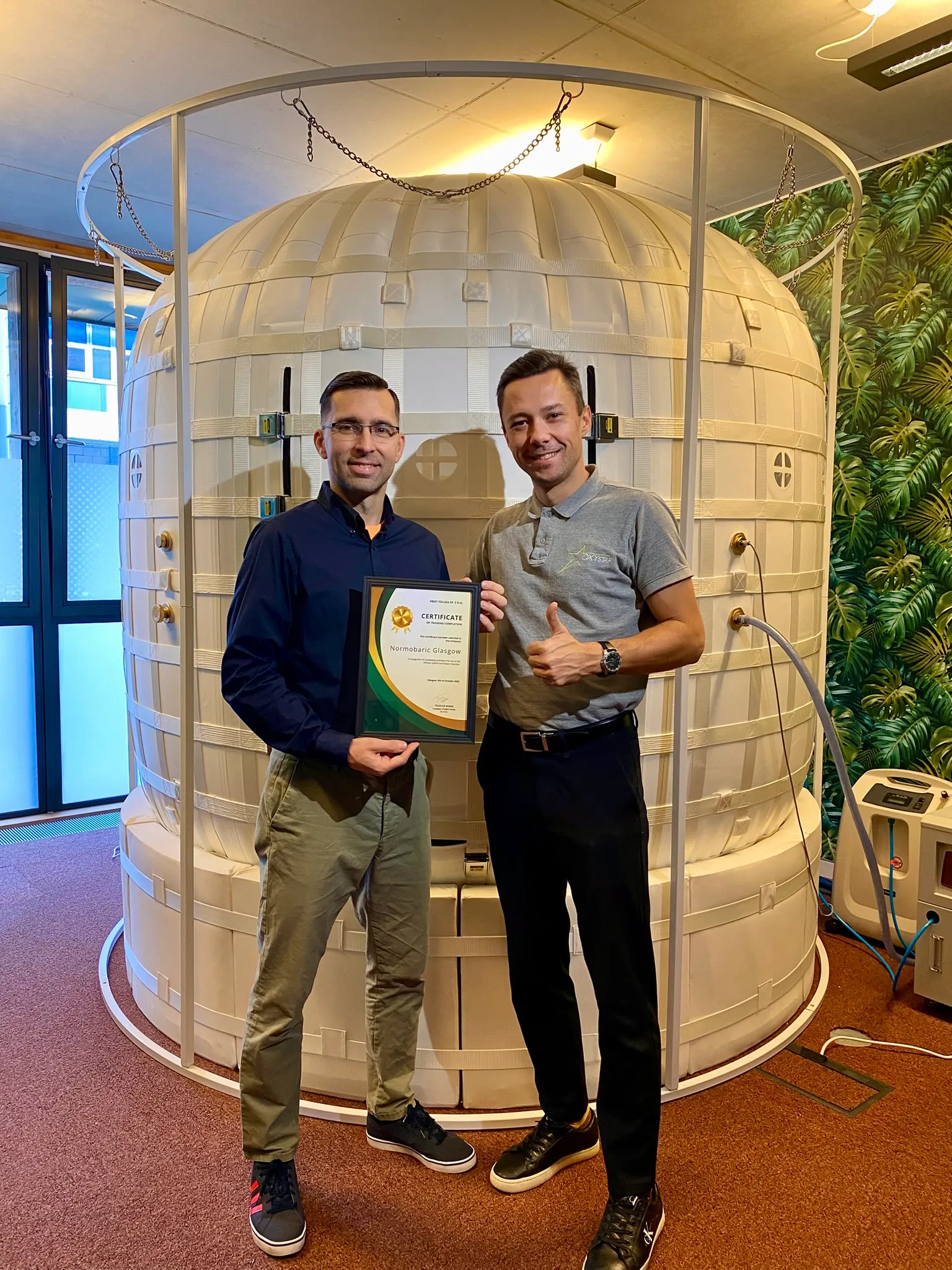 Wszystkie komory normobaryczne OXYstar posiadają certyfikację Międzynarodowego Stowarzyszenia Normobarii, co potwierdza ich zgodność z najwyższymi standardami bezpieczeństwa i efektywności. Każde urządzenie spełnia rygorystyczne wymagania dotyczące ciśnienia atmosferycznego oraz optymalnych stężeń tlenu, dwutlenku węgla i wodoru, zgodnie z wytycznymi dr. Jana Pokrywki.